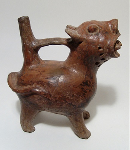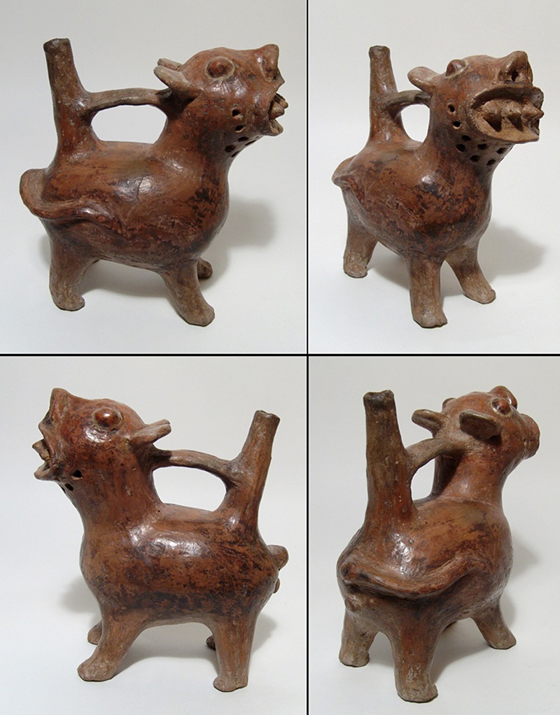 Chimu Zoomorphic Whistle Bottle vessel A fine Chimu Zoomorphic Whistle Bottle vessel from Peru, c. 1100 – 1450 AD. This fine orangeware example is 5-3/4” high and 6" long and features a nicely detailed figure depicted atop the front chamber. The chambers are connected and both are decorated with deeply incised designs. In excellent condition, with good mineral deposits. Ex Sarmiento collection Attribution: Peru, 1100 to 1450 AD Size: 5-3/4-inch high and 6-inch long Condition: Excellent condition, with good mineral deposits. - Please see the picture. BUY NOW $649 plus shipping |