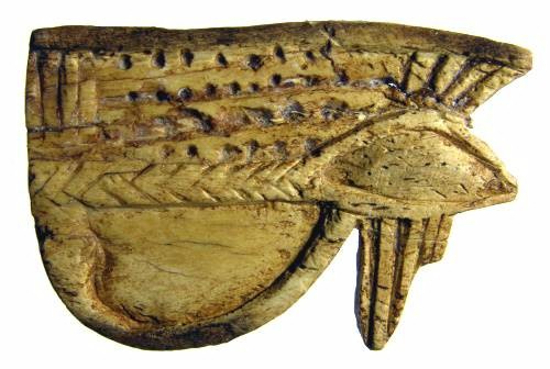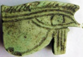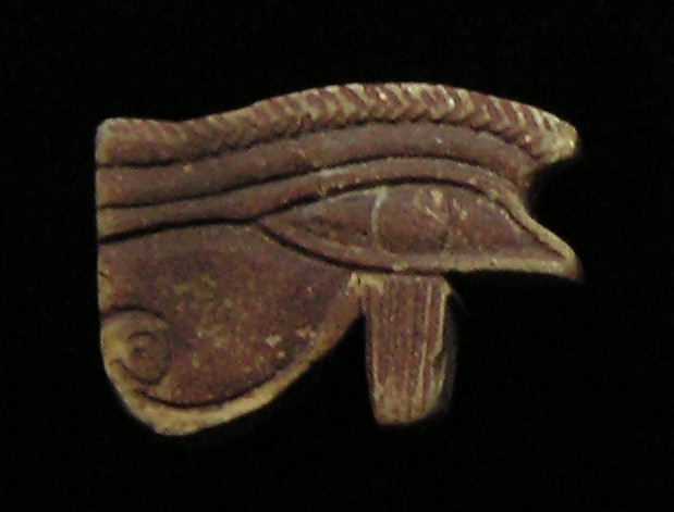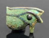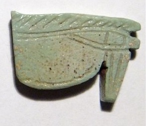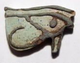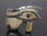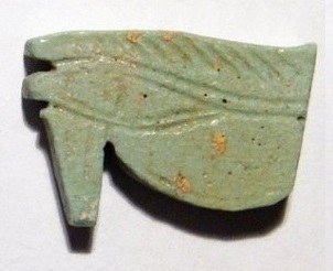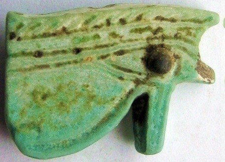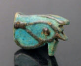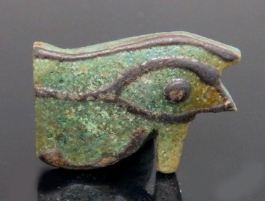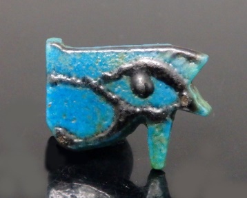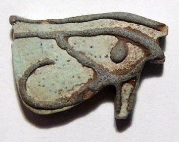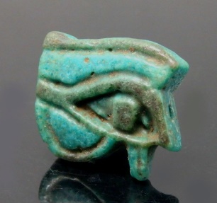 #11724: EYE OF HORUS Amulet - 850 to 550 BC Great Color !!! Historical Context: Designed to resemble the eye of a falcon, this symbol is called the Eye of Ra or Eye of Horus represents the right eye of the Egyptian Falcon God Horus. According to legend, the left eye was torn from Horus by his murderous brother Seth, and magically restored by Thoth, the God of magic. After the restoration, some stories state, Horus made a gift of the eye to Osiris, which allowed this solar deity to rule the underworld. The Eye of Horus represented both the Sun and the Moon and and portions of the Eye of Horus was used in Ancient Egyptian hieroglyphs to represent fractions of number (i.e., 1/4, 1/2, etc.) This Eye of Horus Amulet was worn in ancient Egypt as a symbol of good luck and good health. This Eye of Horus has a hole through the top edge and can be strung on string as a necklace (how it was worn in ancient times). Attribution/Description: Date: