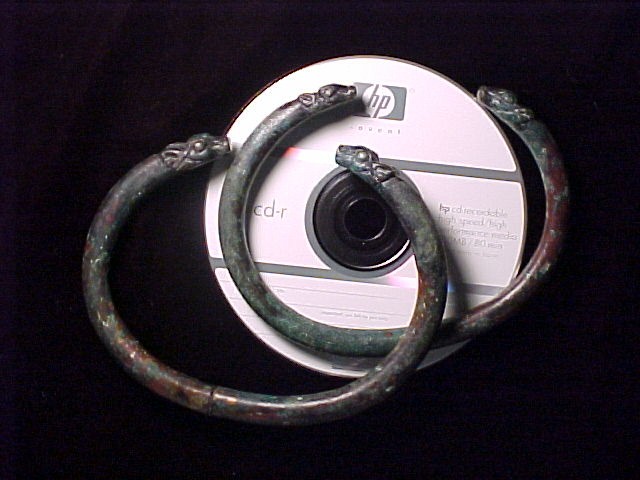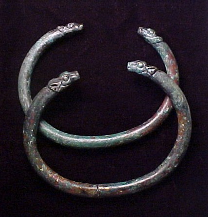 Torques, Matched Pair Historical Context: These torques were manufactured in Persia (Iran) around the 5th Century BC for use in ceremonial procession carried by a Saka Tigraxauda Tribute Bearer. The Apadana, begun by Darius and finished by Xerxes, that was used mainly for great receptions by the kings. Thirteen of its seventy-two columns still stand on the enormous platform to which two monumental stairways, on the north and on the east, give access. They are adorned with rows of beautifully executed reliefs showing scenes from the New Year's festival and processions of representatives of twenty-three subject nations of the Achaemenid Empire, with court notables and Persians and Medes, followed by soldiers and guards, their horses, and royal chariots. On one of the stairways of the Apadana shows the Torque Bearer carrying torques virtually identical to those offer here - See picture here. . See more complete documentation of torque origin here.