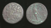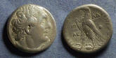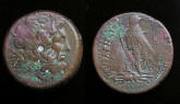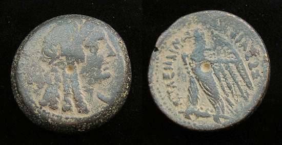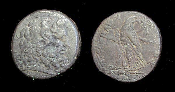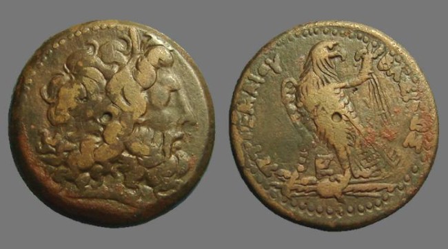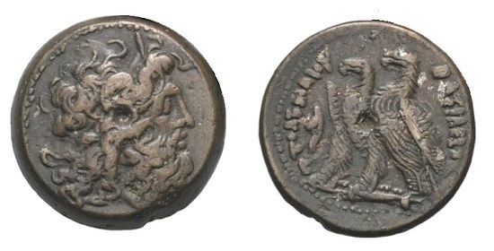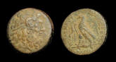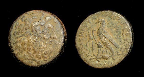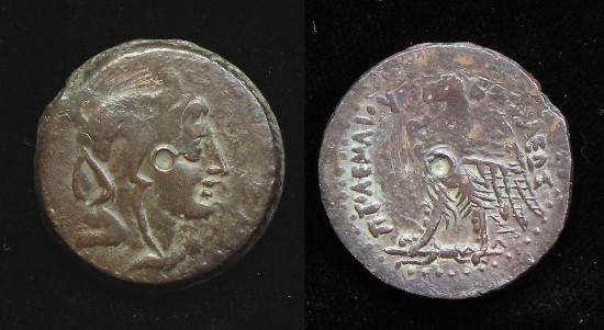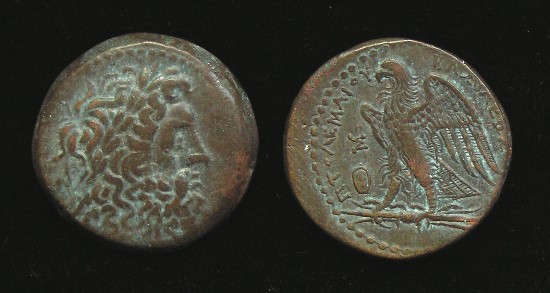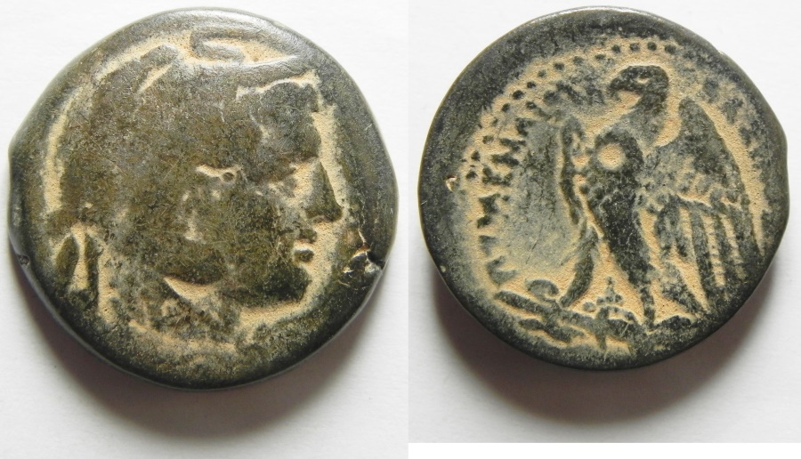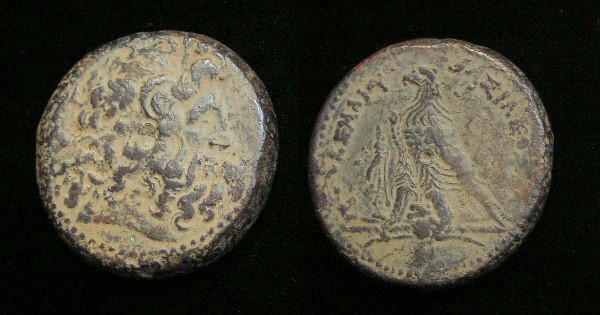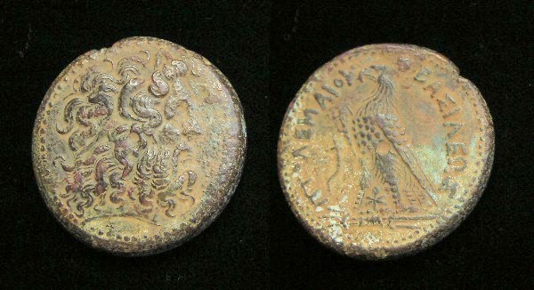 #9626: EGYPTIAN Bronze COIN - 160 BC, Historical Context: Same as above Obverse: ZEUS AMMON, a combination of Greek and Egyptian