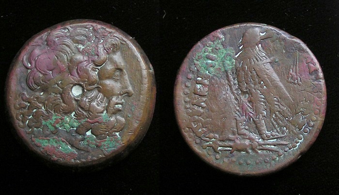 #9643: EGYPTIAN Bronze COIN - 230 BC, Obverse: ZEUS AMMON, a combination of Greek and Egyptian