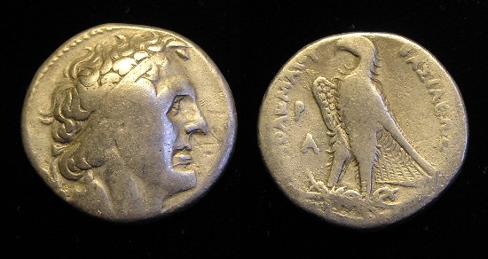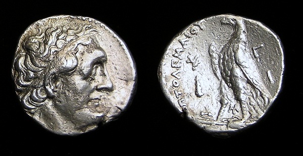 #11405: EGYPTIAN SILVER Tetradrachm - 282 to 246 BC, Reign of Ptolemy II Historical Context: This coin was minted by the Ptolemaic Empire in Egypt around 270 BC, during the reign of Ptolemy II (282 to 246 BC). The obverse (front) of this coin is PTOLEMY I. The Ptolemaic empire was founded by Ptolemy I after the death of Alexander the Great. Ptolemy I was a boyhood friend of Alexander and his most trusted general. After Ptolemy successfully completed the Persian war, Alexander granted him the area of Egypt. He founded an empire that lasted almost 300 years. The empire ended with Cleopatra VII, the Queen of the Nile. Obverse: Ptolemy I