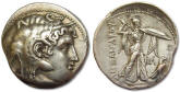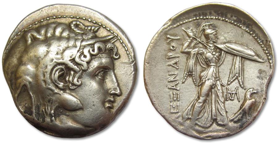 #11879: SILVER TETRADRACHM - 310 BC, Minted by Ptolemy as Satrap of Egypt Historical Context: The Ptolemaic empire was founded by Ptolemy I after the death of Alexander the Great. Ptolemy I was a boyhood friend of Alexander and his most trusted general. After Ptolemy successfully completed the Persian war, Alexander granted him the area of Egypt. He founded an empire that lasted almost 300 years. The empire ended with Cleopatra VII, the Queen of the Nile. This coin was minted shortly after Alexander's death and before Ptolemy assumed the reign as King (Pharaoh) of Egypt. Obv: Alexander the Great in Elephant Skin Cap SOLD $1595 plus shipping