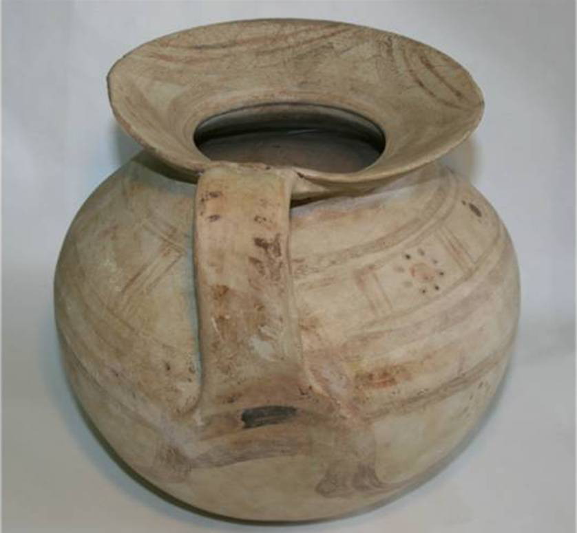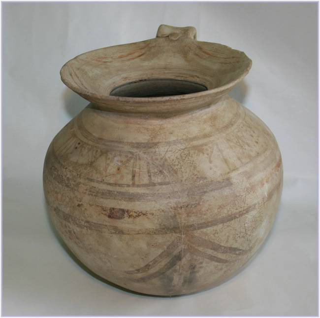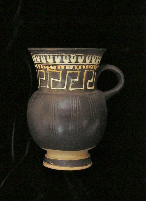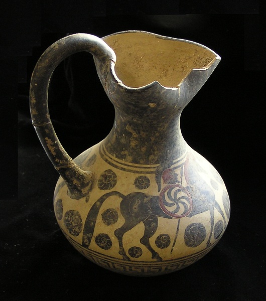 Oinochoe - Decorated with Palm No Repairs - Beautiful !! Historical Context: This Oinochoe (vase) is typical of pottery produced in Magna Graecia and the Mediterranean area about 350 to 300 BC. This is the era of Philip II (Father of Alexander the Great) and Alexander the Great which lead to a unique period of unification of the Mediterranean and Persian worlds. The pattern is typical of the late geometric era.