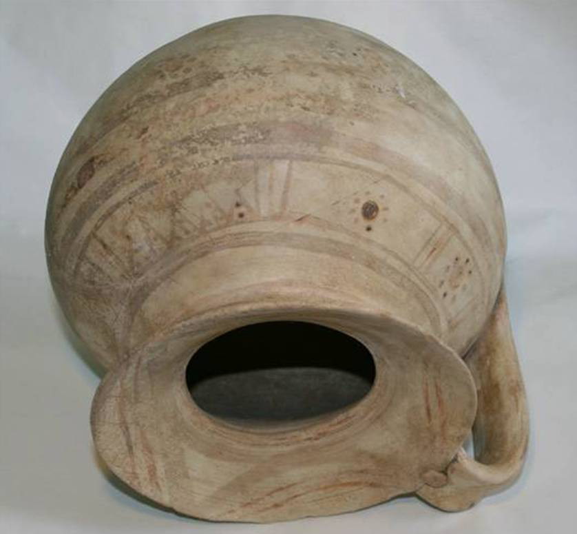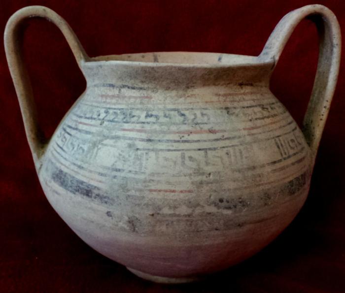 4th to 3rd Century BC (Peucetian Civilization) Decorated with Geometric Designs!! Nice LARGER Piece !! Historical Context: This aryballos is typical of pottery produced in in Apulia (Italian Pennisula) during the 4th to 3rd century BC. This is the geometric era, before the archaic era, about the time of Homer and the founding of Carthage by the Phonecians (814 BC) and the founding of Rome by the Romans (753 BC). An aryballos is a narrow-necked, spherical or globular Greek vase. Commonly used as a scent or oil bottle, particularly by athletes at the baths, the aryballos derives from the globular (oinochoe) of the Geometric style.