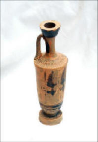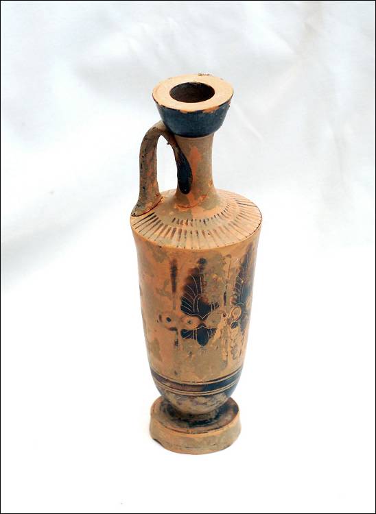 Lekythos - Decorated with Palms Historical Context: This Lekythos (tall vase) is typical of pottery produced in Attica (reghion of Greece near Athens) and the Mediterranean area about the 5th Century BC. This is the era just before Philip II (Father of Alexander the Great) and Alexander the Great. Attica is a historical region of Greece, containing Athens, Marathon, and Sparta. The historical region is centered on the Attic peninsula, which projects into the Aegean Sea. The history of Attica is tightly linked with that of Athens, which from the Classical period onwards, was one of the most important cities in the ancient world. Classical Athens was a powerful city-state. A centre for the arts, learning and philosophy, home of Plato's Academy and Aristotle's Lyceum, it is widely referred to as the cradle of Western civilization and the birthplace of democracy, largely due to the impact of its cultural and political achievements during the 5th and 4th centuries BC on the rest of the then known European continent. ex-London Trade 2007
