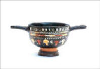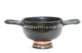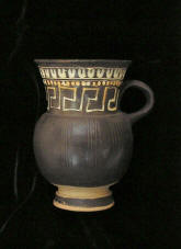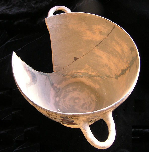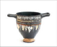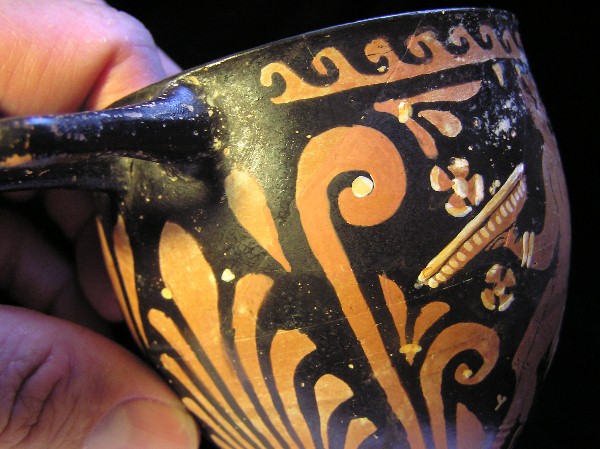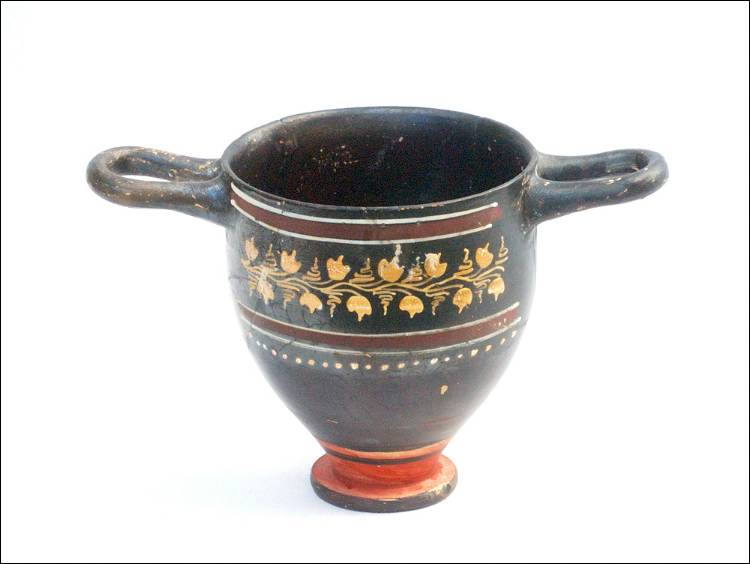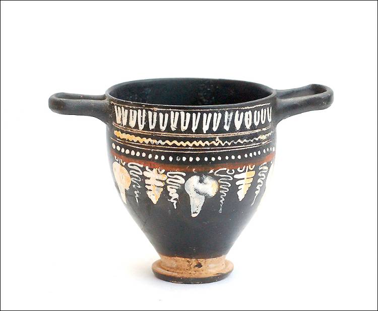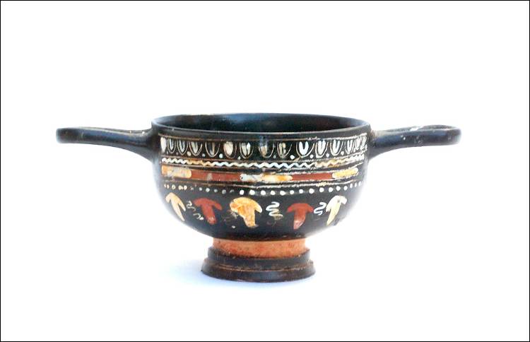 Skyphos - Decorated with Vines and Geometric Patterns Historical Context: This Gnatha Skyphos (large cup) is typical of pottery produced in Apulia (southeastern Italy) and the Mediterranean area about 275 to 225 BC. This is the era just after Alexander the Great and the begining of the rise of the Roman Republic. Apulia is a region in southeastern Italy bordering the Adriatic Sea in the east, the Ionian Sea to the southeast. Its southern portion known as Salento, a peninsula, forms a high heel on the "boot" of Italy. The region extends as far north as Monte Gargano, and was the scene of the last stages in the Second Punic War. One of the richest in Italy for archeological findings, the region was settled from the 1st millennium BC by several Illyric and Italic peoples. In the fifth and fourth centuries BC, the Greek settlement at Taras produced a distinctive style of pottery (Apulian vase painting). Apulia was an important area for the ancient Romans, who conquered it during the course of wars against the Samnites and against Pyrrhus in the fourth and third centuries BC but also suffered a crushing defeat here in the battle of Cannae against Hannibal. However, after the Carthaginians left the region, the Romans captured the ports of Brindisi and Taranto, and established dominion over the region. During the Imperial age Apulia was a flourishing area for production of grain and oil, becoming the most important exporter to the Eastern provinces. ex-London Trade 2007