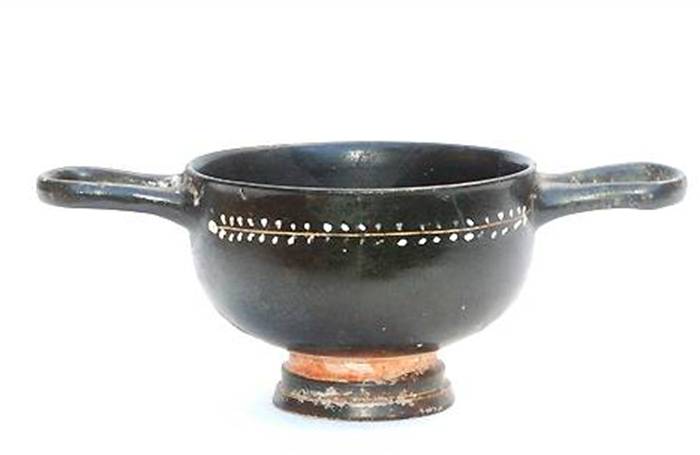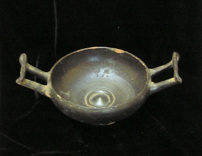 Kylix (Shallow cup) US Pedigree to 1970's !! Historical Context: This Gnatha Kylix (small cup) is typical of pottery produced in Apulia (southeastern Italy) and the Mediterranean area about 275 to 225 BC. This is the era just after Alexander the Great and the begining of the rise of the Roman Republic. Apulia is a region in southeastern Italy bordering the Adriatic Sea in the east, the Ionian Sea to the southeast. Its southern portion known as Salento, a peninsula, forms a high heel on the "boot" of Italy. The region extends as far north as Monte Gargano, and was the scene of the last stages in the Second Punic War. One of the richest in Italy for archeological findings, the region was settled from the 1st millennium BC by several Illyric and Italic peoples. In the fifth and fourth centuries BC, the Greek settlement at Taras produced a distinctive style of pottery (Apulian vase painting). Apulia was an important area for the ancient Romans, who conquered it during the course of wars against the Samnites and against Pyrrhus in the fourth and third centuries BC but also suffered a crushing defeat here in the battle of Cannae against Hannibal. However, after the Carthaginians left the region, the Romans captured the ports of Brindisi and Taranto, and established dominion over the region. During the Imperial age Apulia was a flourishing area for production of grain and oil, becoming the most important exporter to the Eastern provinces.