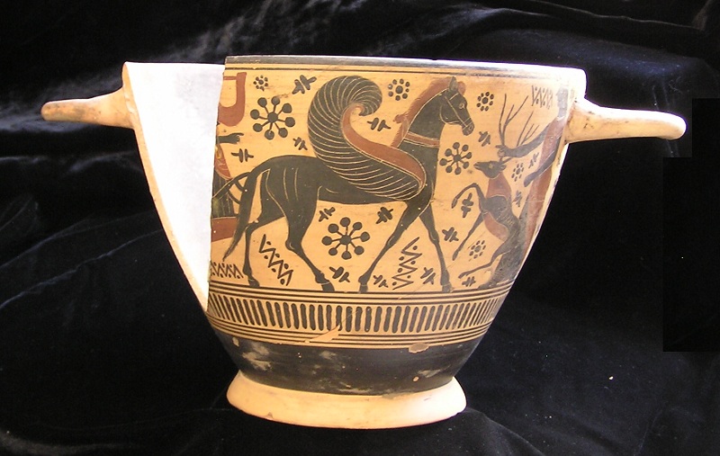 Horse, and Pegasus - US Pedigree to 1970's - Personal Collection of Noted Art Historian !! Historical Context: This Kelebe (Deep Bowl) is unusually sharp and well executed. The use of both red and black figures set this piece apart fo other commmon Greek pottery. This piece was produced in Corinthia (southcentral Greecee) during the 7th to 6th Century BC. This is the era just after Homer and well before the time of Alexander the Great.Pedigree: This piece is from the personal collection of Francois Bucher listed in "DICTIONARY OF ART HISTORIANS"Corinth w as a city-state on the Isthmus of Corinth, the narrow stretch of land that joins the Peloponnesus to the mainland of Greece, roughly halfway between Athens and Sparta.Two of the books in the New Testament, First