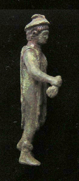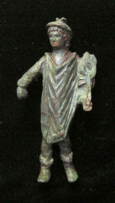 #11468: Greek Region - 4th to 1st Century BC, Small Bronze Statue - Hermes Historical Context: This statue is typical of small ornamental statues produced in Magna Graecia and the Mediterranean area about 4th to 1st centuries BC. This is the period where the Italian peninsula is transitioning from Greek colonies to total Roman control. Hermes: God of boundaries, travel, communication, trade, thievery, trickery, language, writing, diplomacy, athletics, and animal husbandry. The son of Zeus and Maia, Hermes is the messenger of the gods, and apsychopomp who leads the souls of the dead into the afterlife. He was depicted either as a handsome and athletic beardless youth, or as an older bearded man. His attributes include the herald's wand or caduceus, winged sandals, and a traveler's cap. His sacred animals are the tortoise, the ram, and the hawk. The Roman Mercury was more closely identified with trade and commerce. Features: Hermes holding his caduceus and wearing a cloak (chlamys) and hat (petasus) for travel Height: 75mm (2 3/4 inches) Condition: In tact, Relatively even colored patina