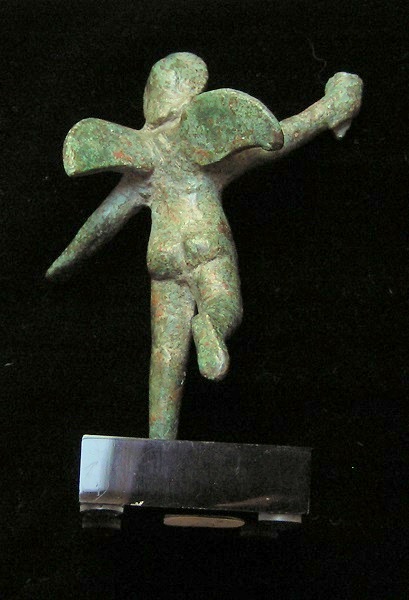 #11469: Greek Region - 4th to 1st Century BC, Small Bronze Statue - Eros Eros, god of love and sexual intercourse Mounted on Base !!Historical Context: This statue is typical of small ornamental statues produced in Magna Graecia and the Mediterranean area about 4th to 1st centuries BC. This is the period where the Italian peninsula is transitioning from Greek colonies to total Roman control. EROS: He was the Greek god of love. His Roman counterpart was Cupid ("desire"). Some myths make him a primordial god, while in other myths, he is the son of Aphrodite. In later Greek mythology, Eros is represented as the son of Aphrodite, whose mischievous interventions in the affairs of gods and mortals cause bonds of love to form, often illicitly. Ultimately, in the later satirical poets, he is represented as a blindfolded child, the precursor to the chubby Renaissance Cupid – whereas in early Greek poetry and art, Eros was depicted as an adult male who embodies sexual power. A cult of Eros existed in pre-classical Greece, but it was much less important than that of Aphrodite. However, in late antiquity, Eros was worshiped by a fertility cult. In Athens, he shared a very popular cult with Aphrodite, and the fourth day of every month was sacred to him.