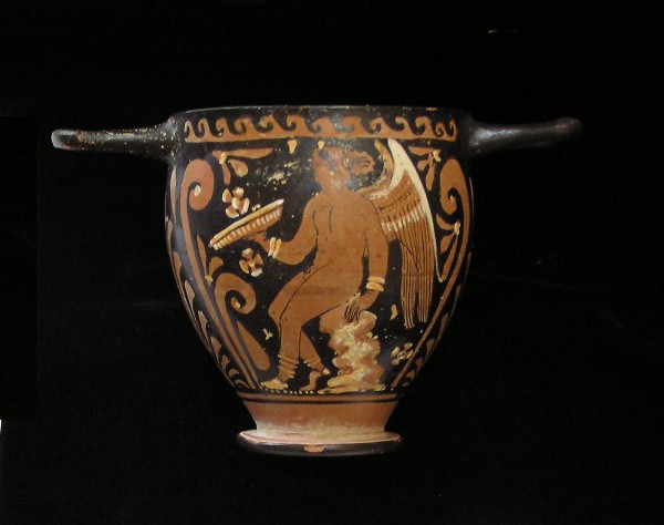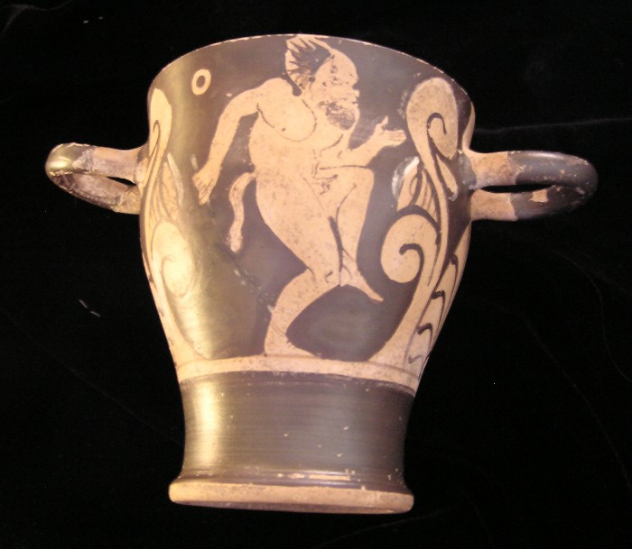 Skyphos - Decorated with Satyr and "Lady of Fashion" - like APHRODITE !! Outstanding Piece !! Historical Context: This Gnatha Skyphos (large cup) is typical of pottery produced in Magna Graecia and the Mediterranean area about 350 to 300 BC. This is the era of Philip II (Father of Alexander the Great) and Alexander the Great which lead to a unique period of unification of the Mediterranean and Persian worlds. The Satyr is portrayed as being strongly built with pug nose, large pointed ears, long curly hair, and full beards. They are described as roguish but faint-hearted folk, subversive and dangerous, yet shy. They are lovers of wine, women and boys, and are ready for every physical pleasure. The female is a "Lady of Fashion" often found during this era and is similar to Aphrodite, Greek Goddess of love.