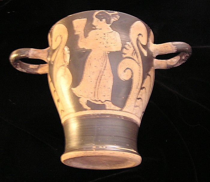Skyphos - Decorated with Nike and "Lady of Fashion" - like APHRODITE !! Outstanding Piece !! Historical Context: This Gnatha Skyphos (large cup) is typical of pottery produced in Magna Graecia and the Mediterranean area about 350 to 300 BC. This is the era of Philip II (Father of Alexander the Great) and Alexander the Great which lead to a unique period of unification of the Mediterranean and Persian worlds. The Nike is seated on rocks holding a wreath. Nike's hair is pulled to back and decorated. He is naked with exposed phallus. Nike represents victory, typically over an enemy state. The female is a "Lady of Fashion" often found during this era and is similar to Aphrodite, Greek Goddess of love.