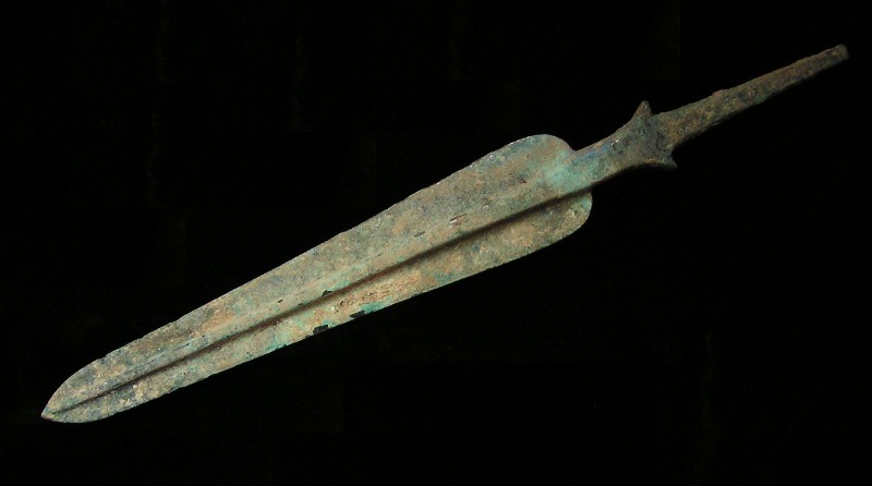 #9056: Mesopotamia/Luristan Spear Tip - 1,200 to 900 BC This spear tip is BRONZE and measures about 220 mm (9 inches) long. Choice plus condition, Edge still sharp !!!