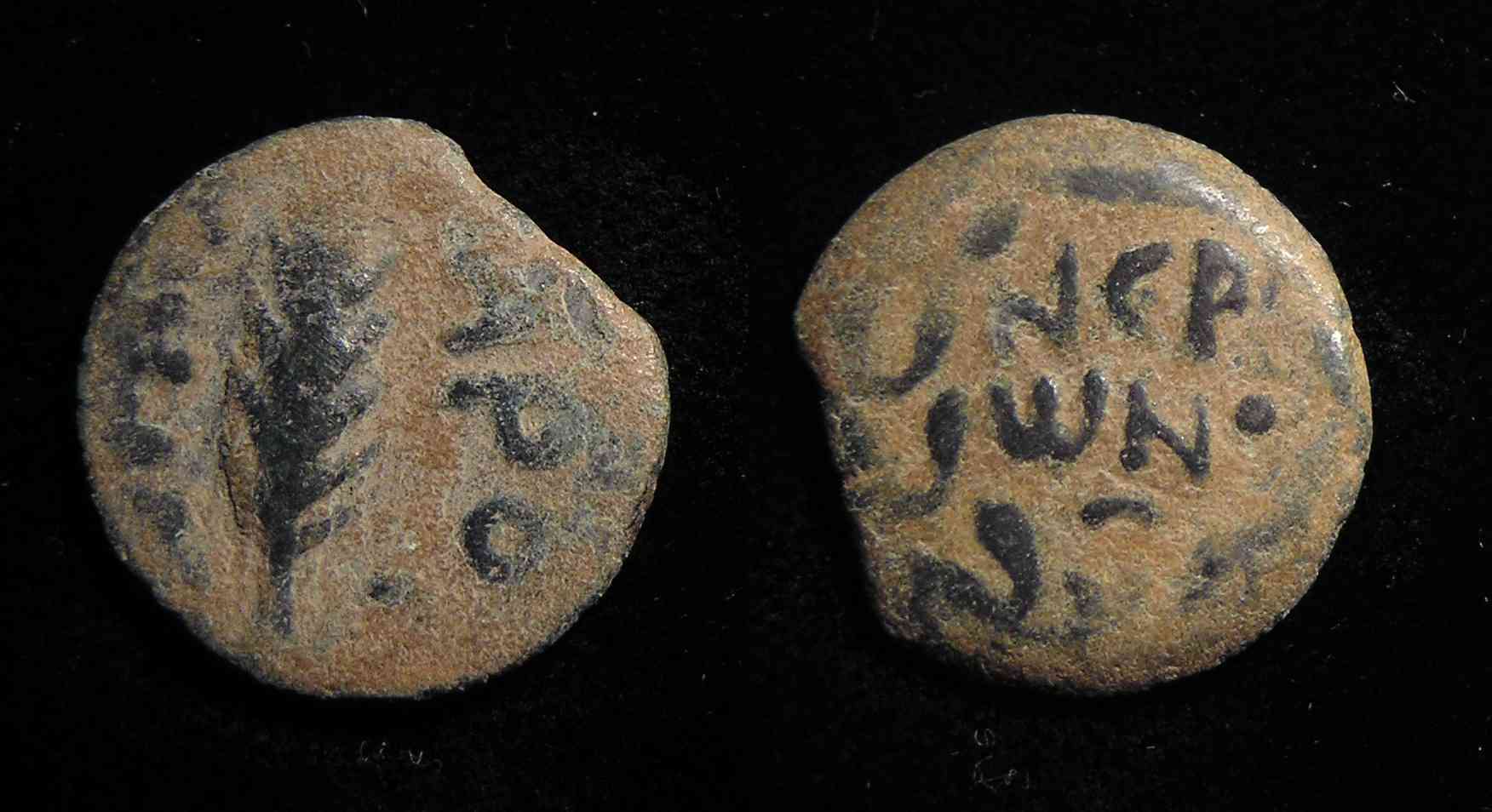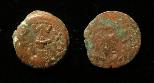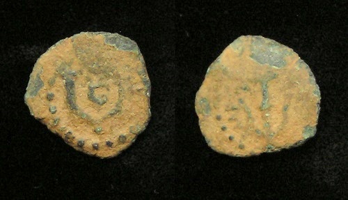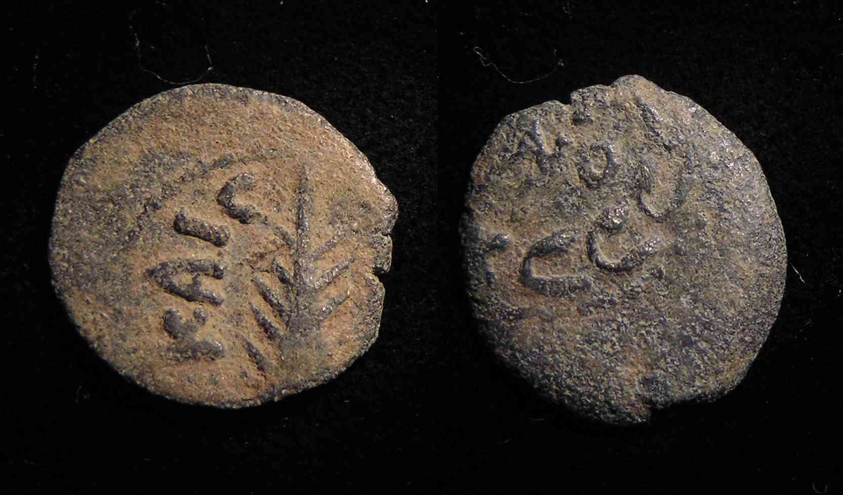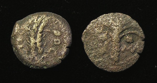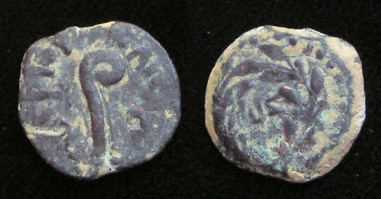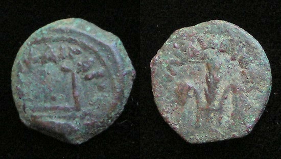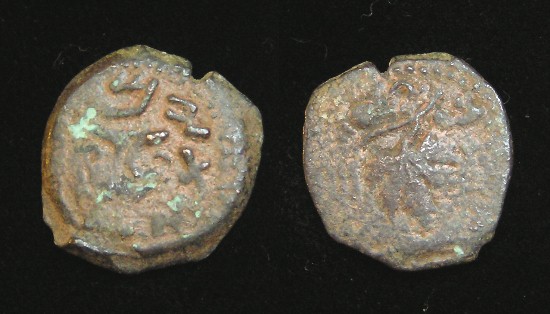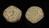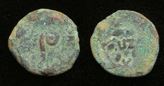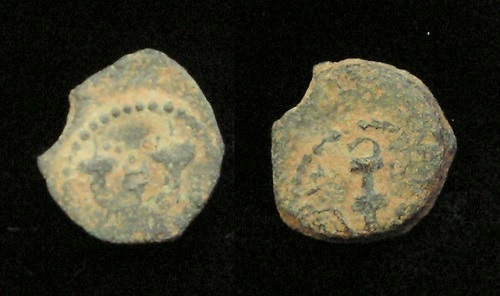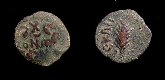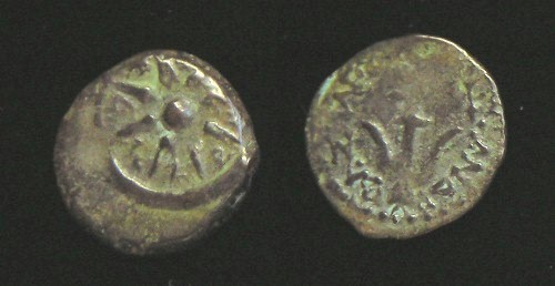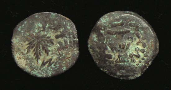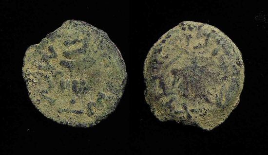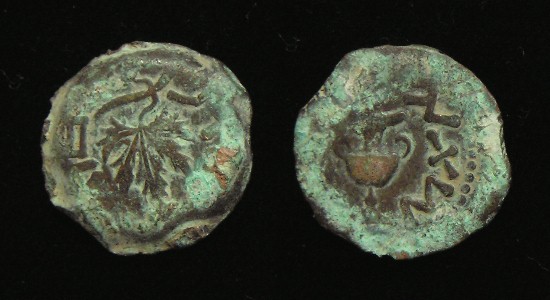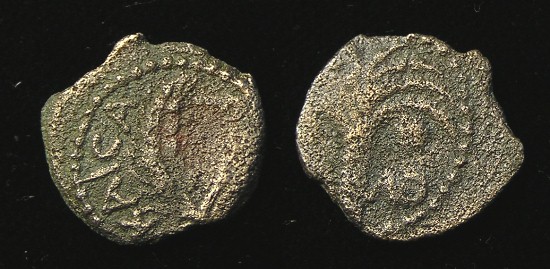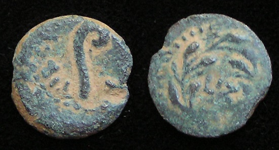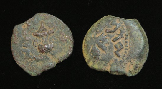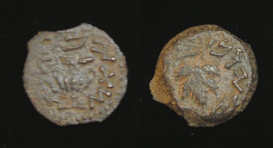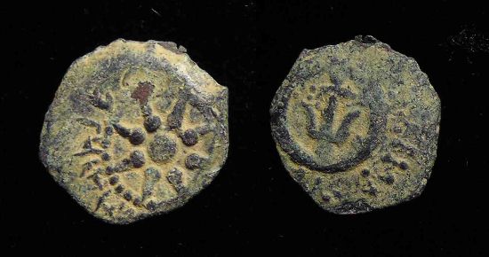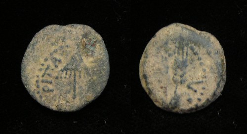 These coins were minted in ANCIENT JUDEA between 103-76 BC. Although these coins were struck before the time of Jesus, they were the most widely circulating coins in Judea during his lifetime. The Bible story of the Widow who gave all that she had (two mites) is one of the most popular Biblical stories. In ancient Judea, a destitute woman, who was widowed, contributed most of what money she probably had to the temple as an offering. Jesus observed her generosity and told his disciples "I say unto you that this poor widow hath cast more in than all they (the rich men) have cast into the treasury. For all they did cast in of their abundance but she of her want did cast in all that she had." (Mark 12:41-44) Jewish Prutah, like the coin offered, were the most common small denomination bronze coin in Ancient Judea and is believed that these are the most likely coins that the "Poor Widow" actually had in her hand.