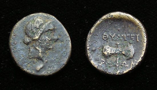 #10288: Greek BRONZE - 2nd Century BC, Thyatira (Lydia) - RARE Area of One of the Seven Churches of the Book of Revelation Historical Context: These coins were minted in Thyateira (also Thyatira) is the name of the modern Turkish city of Akhisar ("white castle"). The name comes from Koine Greek "Θυάτειρα" (Thuateira). It lies in the far west of Turkey, south of Istanbul and almost due east of Athens. It is about 50 miles (80 km) from the Mediterranean. In early Christian times Thyateira was home to a significant Christian Church, mentioned as one of the seven Churches of the Book of Revelation in the Book of Revelation. The Apostle Paul and Silas might have visited Thyateira during Paul's second or third journey, although the evidence is entirely circumstantial. Obv: Apollo SOLD $69.95 plus shipping