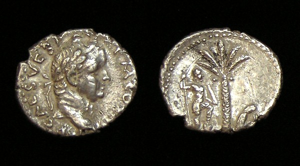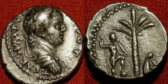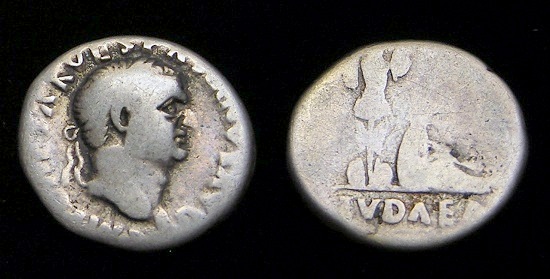These coins were minted starting in 70 AD to commemorate the Roman conquest of Judea. On the one side of the coin there appears "Judaea" or :Judaea capta" ("Judea conquered"). Judea is typically depicted as a mourning woman sitting under a military trophy or palm tree. The head of the Emperor appears on obverse side of the coin. "Thy men shall fall by the