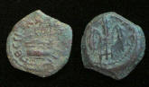 - 10 BC, HEROD the GREAT !! Historical Context: See above Attribution: Judea, 10 BC, Herod the Great: The obverse (front) of this coin is an ANCHOR and legend. The reverse scene is a DOUBLE CORNUCOPIA and CADUCEUS. This coin is in "Good" condition and has good detail on both sides. The strike is strong on both sides.. This coin has nice coloring (deep brown). This coin is BRONZE measuring about 16 mm diameter (almost the diameter of a US dime). |