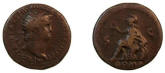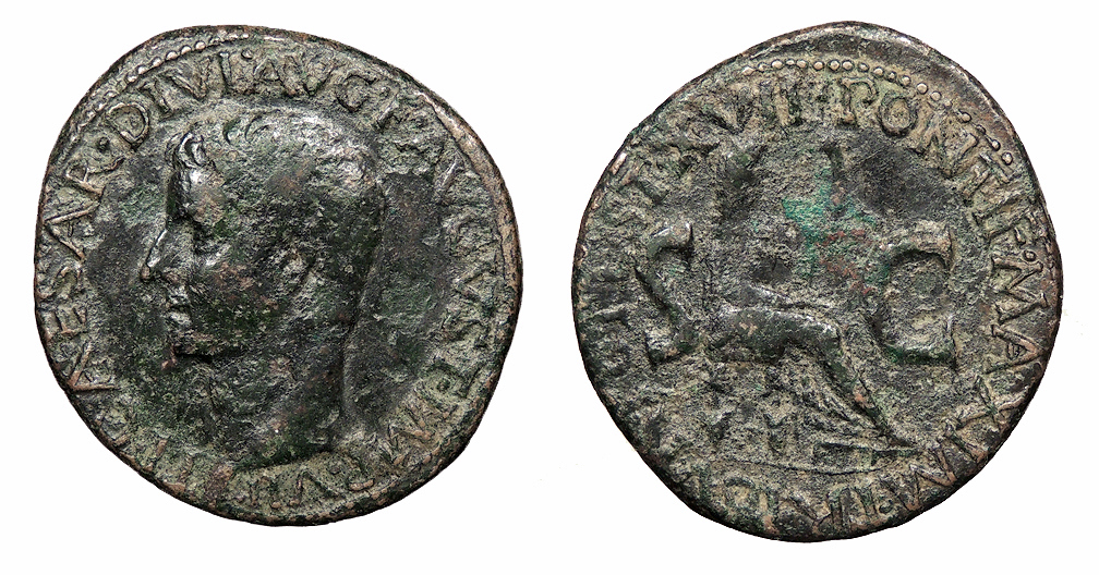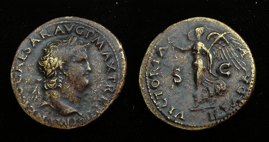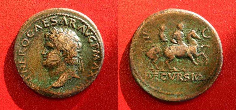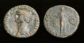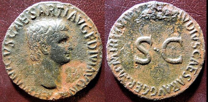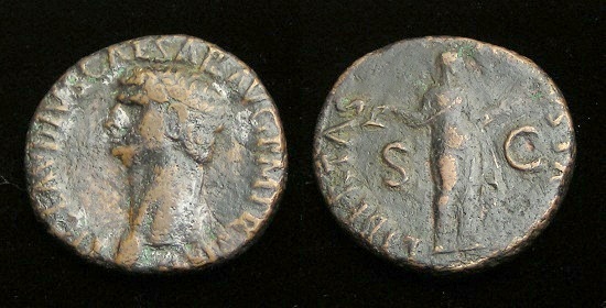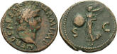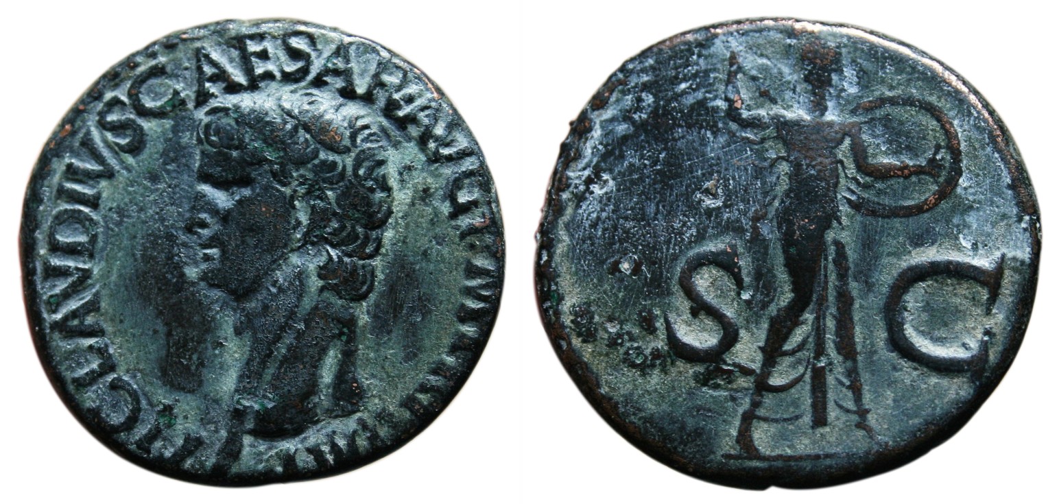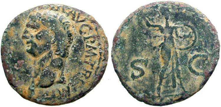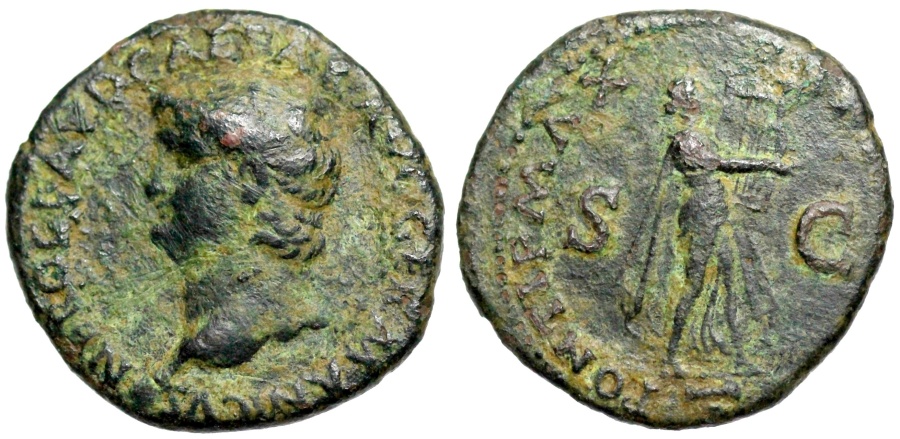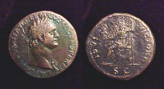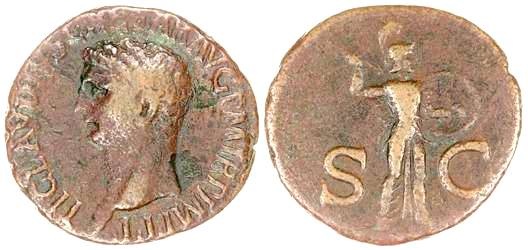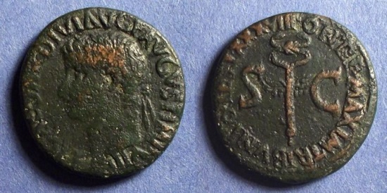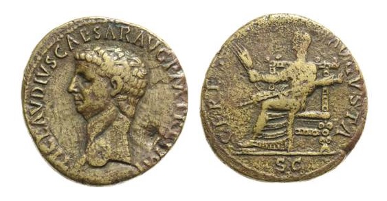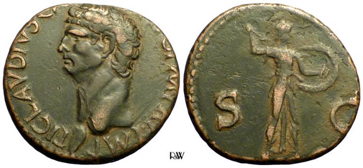 CLAUDIUS: An Unlikely Emperor 41 AD to 54 AD Historical Context: This coin was minted by the ROMAN EMPIRE during the reign of CLAUDIUS (41 - 54 AD). Born Tiberius Claudius Drusus, a childhood attack of infantile paralysis had left him with a grotesque appearance. He was proclaimed (or actually adopted) emperor by the Praetorian Guard. In spite of all that, he proved himself a very capable administrator. He married his niece, Agrippina Junior, and adopted her son, Nero, who became the heir to the throne. He died in 54, most likely by poisoning by his wife, so that her son would be assured to succeed him.