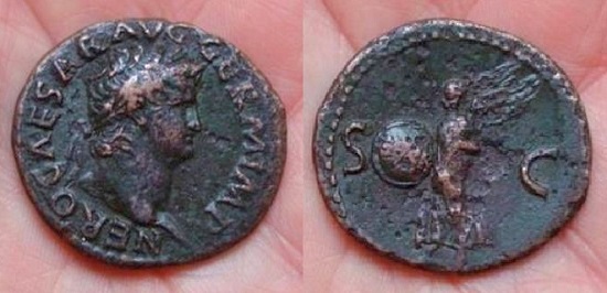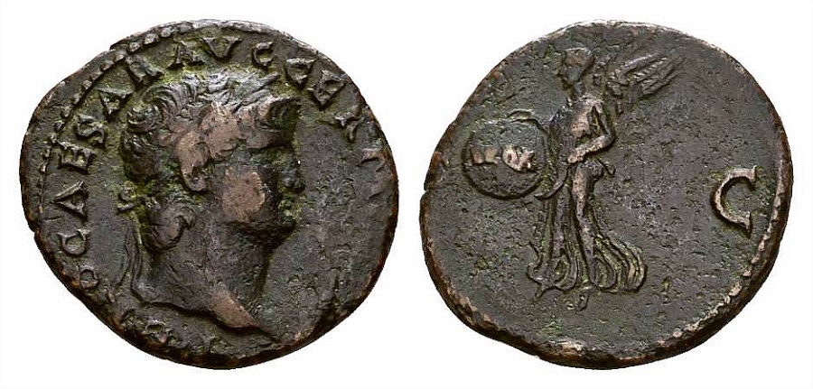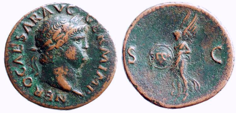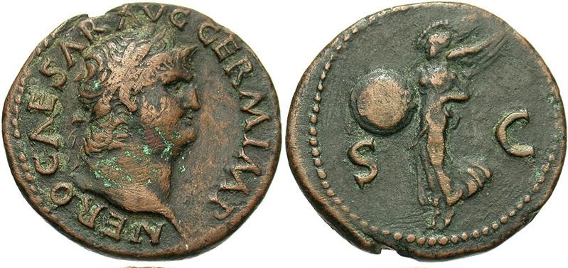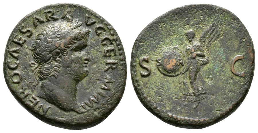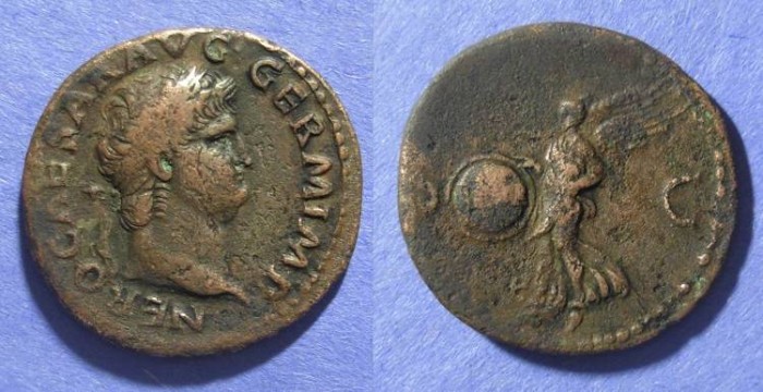 #11074: AE As - 60 AD, NERO, 54 to 68 AD VICTORY Placing Laural Wreath Historical Context: See above Obv: Nero, right facing BUY NOW $169 plus shipping