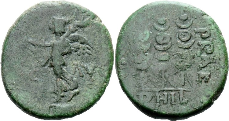 Augustus, 29 BC to 14 AD (Commemorates Battle of Philipi, where the forces of Augustus and Marc Antony defeated the forces of Brutus) Historical Context: See above Obv: Victory placing Wreath SOLD $59.95 plus shipping