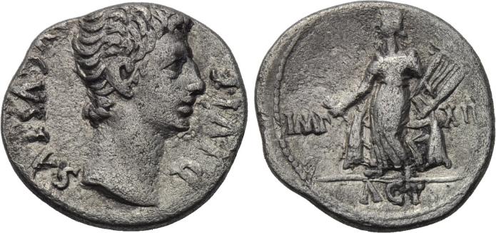 #11472: SILVER Denarius - 27 BC, Augustus, Refers to BATTLE of ACTIUM (Defeat of Cleopatra and Marc Antony) !! Historical Context: See above "Historical Context." Obv: Augustus SOLD $239 plus shipping