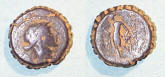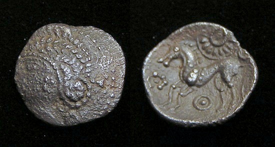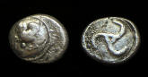 #11123: CELTIC Drachm 1st Cent BC Historical Context: This coin was minted by the CELTICS around the reign of Philip II of the MACEDONIAN EMPIRE (494 - 168 BC). Philip II was the father of ALEXANDER THE GREAT. The CELTS originated in northern Europe (Germany and France) and dispersed over all of northern Europe. They were formable warriors who served as mercenaries. In the 2nd Century BC, they controlled all of northern Europe (Ireland to Spain). Their coinage often copies that of their Greek neighbors probably because they did not use coins internally, but used them primarily for trade. Original Celtic art is very abstract. Their coins follow that abstract concept. The Celts were ultimately overcome by the Romans in the first century AD. Obv: Head, Celtic Stylized SOLD $199 plus shipping