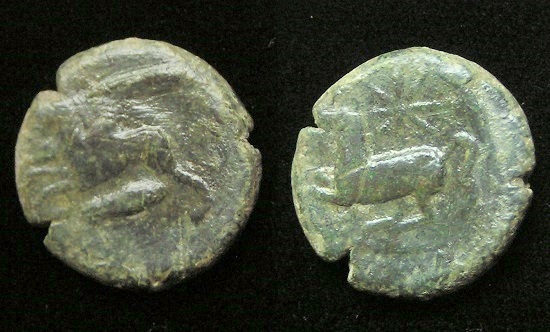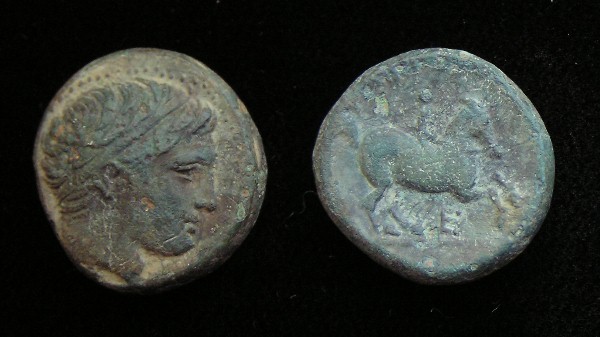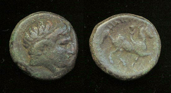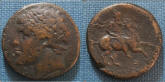 #9942: Bronze – 350 BC, Commemorates an OLYMPIC GAMES VICTORY !! Pretty !! Historical Context: This coin was minted by the MACEDONIAN EMPIRE (494 - 168 BC) during the reign of Philip II. When Philip II was young he won two Olympic equestrian victories. His coins often commemorate those victories. This reverse of this coin shows Philip II's jockey on horseback. Some believe the reverse is intended to be Alexander the Great (as a boy) on Horseback, referring to a challenge that Philip issued to Alexander regarding riding a certain horse. Obv: Apollo (Very Artistic representation) SOLD $99.95 plus shipping