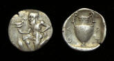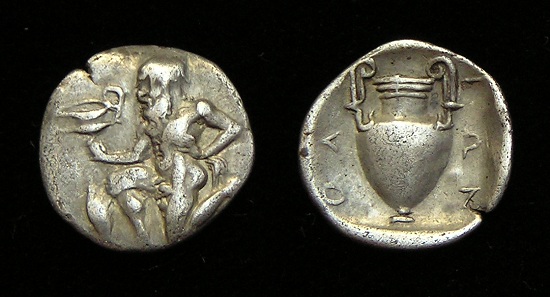 Obv: Satyr kneeling holding Amphora