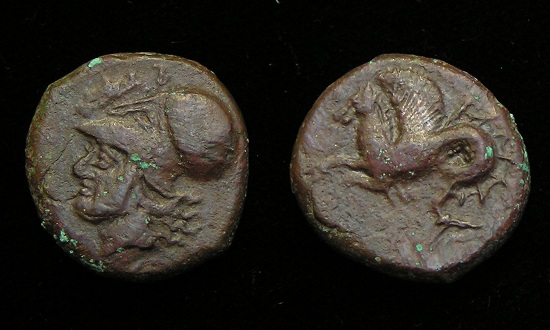 #10947: Bronze Coin - AE10, Troas, Scepsis 400 to 310 BC Winged Horse Obv: Forepart of Winged Horse in Cornucopia SOLD $39.95 plus shipping