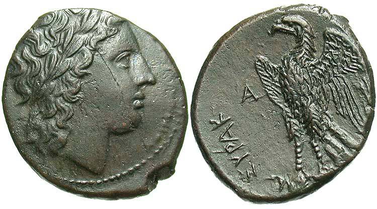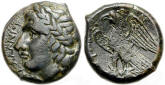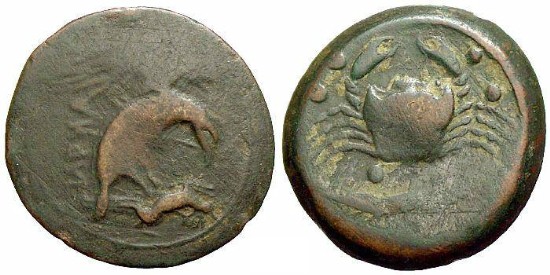 #9676: Bronze Unit (AE29) - SICILY.AKRAGAS, before 413 BC, Eagle / Crab Historical Context: See above Obv: Eagle SOLD $219 plus shipping