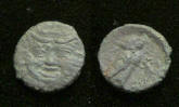 #10711: Small Bronze Coin - AE11 - 2nd Cent BC, Gorgon / Owl Kamarina, Sicily Interesting Type !! Historical Context: This coin was minted in Smyrna, Ionia in the 2nd and 1st centuries BC. Obv: Gorgon