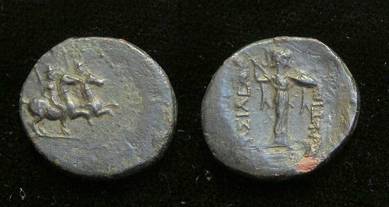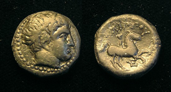 #11067: Bronze – 350 BC, Commemorates an OLYMPIC GAMES VICTORY !! Pretty !! Historical Context: This coin was minted by the MACEDONIAN EMPIRE (494 - 168 BC) during the reign of Philip II. When Philip II was young he won two Olympic equestrian victories. His coins often commemorate those victories. This reverse of this coin shows Philip II's jockey on horseback. Some believe the reverse is intended to be Alexander the Great (as a boy) on Horseback, referring to a challenge that Philip issued to Alexander regarding riding a certain horse. Obv: Apollo (Very Artistic representation) SOLD $69.95 plus shipping