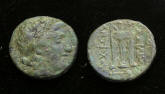 #9443: AE20 - 2nd and 1st Cent BC, Apollo / Homer, The Poet Great Collector Piece !! Historical Context: This coin was minted in Smyrna, Ionia in the 2nd and 1st centuries BC. Obv: Young Apollo