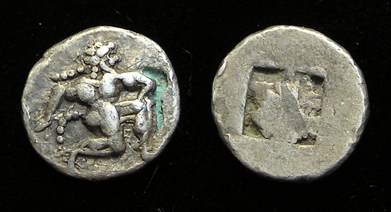SILVER Trihemiobol - 411 to 350 BC, Pamphila, Thasos, Off Thrace Satyr Kneeling holding Amphora / Amphora!! Historical Context: Thasos was a Thracian Island in Northern Greece. It was a rich and fertile island with prolific gold and silver mines. The area was settled by Greek colonist during the 7th century BC. The Greek cultural centered around Aigai, but was of no great importance until the reign of Alexander I (495-454 BC). Philip II (Father of Alexander the Great) initiated the dynamic expansion setting the stage for Alexander. Obv: Satyr kneeling holding Amphora