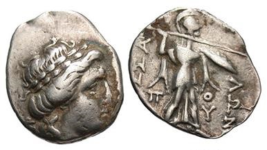 League !! Apollo with Athena Itonia Historical Context: This coin was minted by the THESSALIAN LEAGUE around 196 to 146 BC. Following the great victory of the Roman General Flamininus over Philip V of Macedon, in 197 BC. The freedom of the Greeks was proclaimed at Corinth and a number of new autonomous coinages were initiated. Those in the name of the Thassalian League were probably minted at Larissa. The Thessalian league was a loose confederacy of feudal like states run by a few great Thessalian families. The seat of the Thessalian diet was Larissa. Obv: Apollo, Greek Sun God and Patron of Music