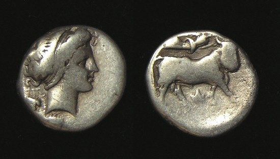 #9382: Silver Didrachm – 400 to 335 BC, Hyria, Campania Historical Context: This coin was minted in Syracuse during the 5th and 4th centuries BC. Campania was a Greek region on the western shore of Italy. These coins "Romano-Campanian" didrachms were deliberately intended to supplant the Greek didrachms in southern Italy. Some were actually produced by Greek mints acting under Roman direction. Obv: Athena in Crested