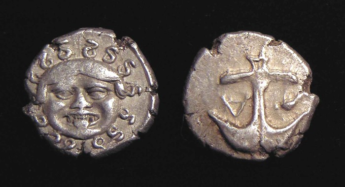 Historical Context: This coin was minted in APOLLONIA PONTIKA (a colony of Miletos, a city which boasted a fine temple of APOLLO). Apollonia was located on the western shore of the BLACK SEA. This area was settled by the Greeks during the 8th and 7th centuries BC and eventually became hellenized over the subsequent centuries. Attribution: APOLLONIA PONTIKA, 450 BC: The obverse (front) of this coin is a GORGON FACE (Medusa), tounge protruding. The Gorgon was a mythical creature capable of turning people to stone!!! The reverse scene is an ANCHOR with a Letter "A" and cuddlefish!! This coin is in "Very Fine plus" condition. The strike is strong on both sides. This coin is a SILVER DRACHM. It measures about 14 mm diameter (almost the diameter of a US dime but twice as thick). SOLD