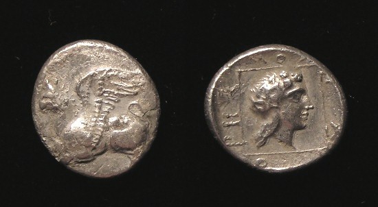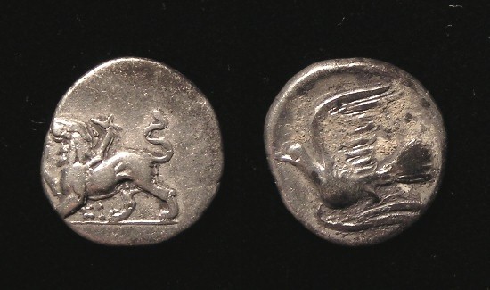 was a major large “island” south of mainland Obv: Chimera (Mythical creature) - Lion, Goat Head out