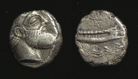 #9592: SILVER Stater - 4th Century BC, Historical Context: This coin was minted in PHOENICIA (Sidon) around 350 BC. Phoenicia was a coastal area just north of Palestine/Judea. It contained numerous important trade and port cities, including Arados, Tripolis, Byblos, Sidon, and Tyre. Phoenicia was originally controlled by the Persian empire. Around 340 BC, Phoenicia was conquered by Alexander the Great. After his death (323 BC), Control of Phoenicia was traded between the Ptolemaic dynasty of Egypt and the Seleukid Dynasty of Syria until the Roman in the 1st Century BC. Obv: