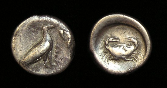 SILVER Didrachm - SICILY.AKRAGAS, before 413 BC, Eagle / Crab Historical Context: Akragas was founded on a plateau overlooking the sea, with two nearby rivers and a ridge to the north offering a degree of natural fortification. Its establishment took place around 582-580 BC and is attributed to Greek colonists from Gela, who named it Akragas. Akragas grew rapidly, becoming one of the richest and most famous of the Greek colonies of Magna Graecia. It came to prominence under the sixth-century tyrants and became a democracy after the overthrow of Theron's son Thrasydaeus. Although the city remained neutral in the conflict between Athens and Syracuse, its democracy was overthrown when the city was sacked by the Carthaginians in 406 BC. Akragas never fully recovered its former status. The city was sacked by both the Romans and the Carthaginians in the third century. The Romans eventually captured Akragas in 210 and renamed it Agrigentum. It became prosperous again under Roman rule and its inhabitants received full Roman citizenship following the death of Julius Caesar in 44 BC. Obv: Eagle SOLD $379 plus shipping