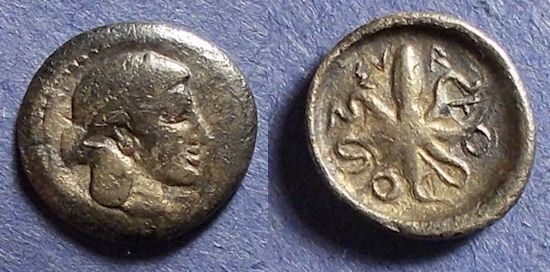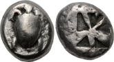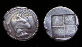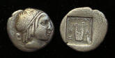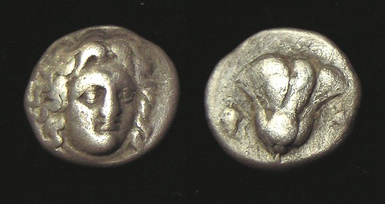 #11118: SILVER Hemidrachm - 3rd Cent BC, Historical Context: This coin was minted in MILETOS about 515 to 480 BC. Miletos was located on the southern coast of IONIA in western ASIA MINOR. It was minted during the 4th Century BC. It was one of the earliest mints, though its prosperity was greatly curtailed following the defeat of the Ionian revolt against Persia about the early 5th Century BC. It was the "Mother City" of many famous colonies, including Abydos, Kyzikos, Sinope, and Pantikapaion. Obv: Apollo