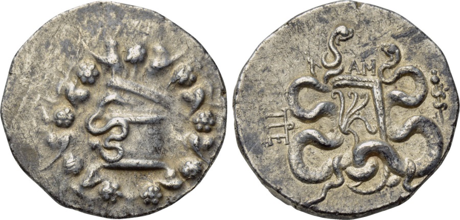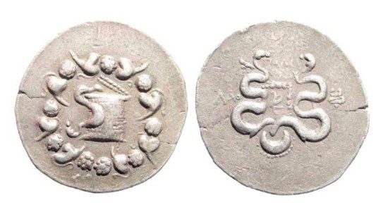 #10249: SILVER Cistophoric Tetradrachm, Historical Context: This coin was minted in Ephesos about the 2nd to 1st Century BC. Ephesos was situated at the mouth of the Kayster river. Ephesos was founded by IONIAN colonists under Androklos. It rose to a place of great importance in Classical times and Hellenistic times, due in part to its beautififul sanctuary of the Ephesian Artemis. After the end of the Pergamene Kingdom in 133 BC, then fell under Roman rule. Obv: Cista Mystica BUY NOW $219 plus shipping