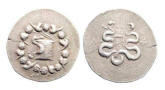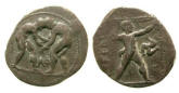 Cent BC, Historical Context: These coins were minted in Thracian Cherronesos (AKA Chersonese) about 400-350 BC. Thrace was just north and east of Macedonia on the Aegean Sea. Greek Colonists settled this area during the 8th and 7th centuries BC. The interior areas were primarily populated by the indigenous tribes. They became partially Hellenized by contact with the Greeks. Their contact with the Greeks was mainly in the form of trade. They had significant silver mines available and struck coins for mainly for trade purposes. Their coinage often depicted scenes "close to nature," which explains the Lion motif of the obverse and many of the reverse symbols. Obv: Forepart of Lion SOLD $59.95 plus shipping
