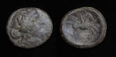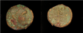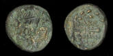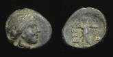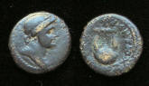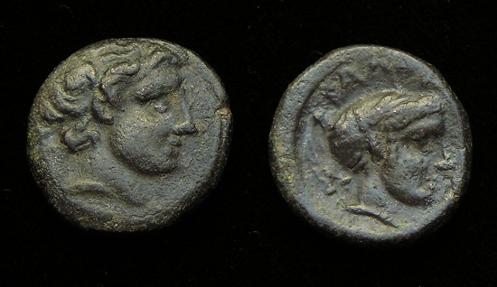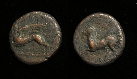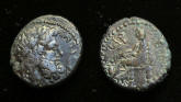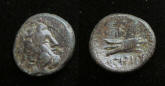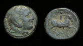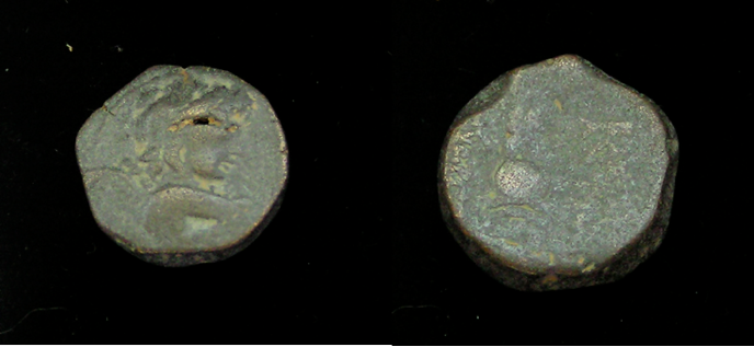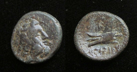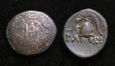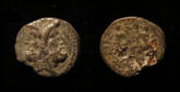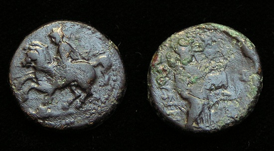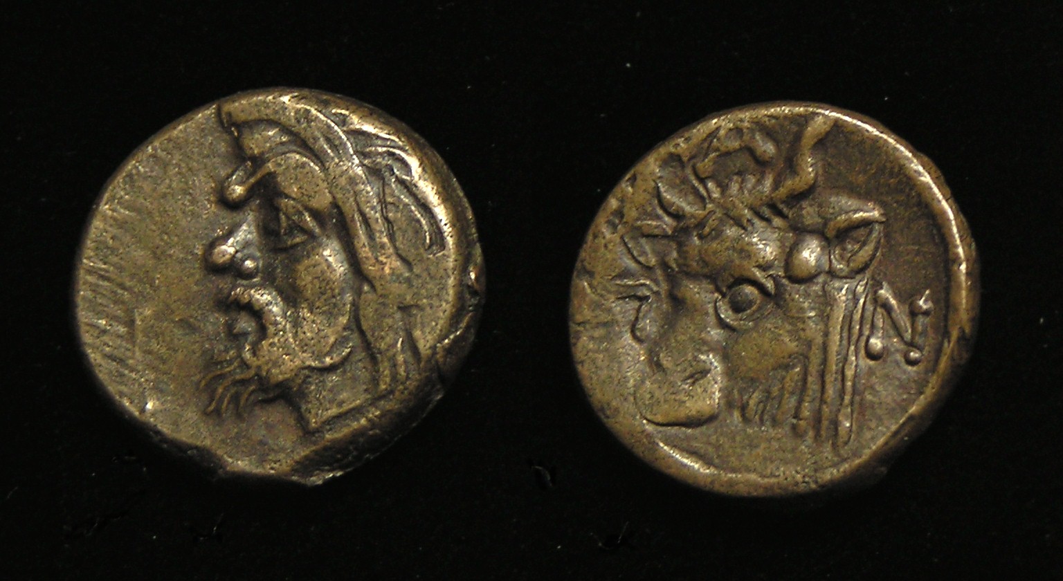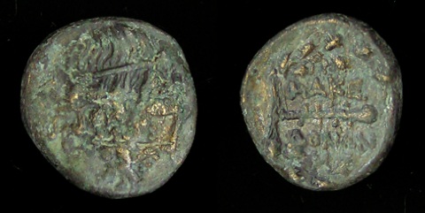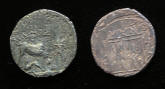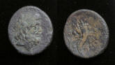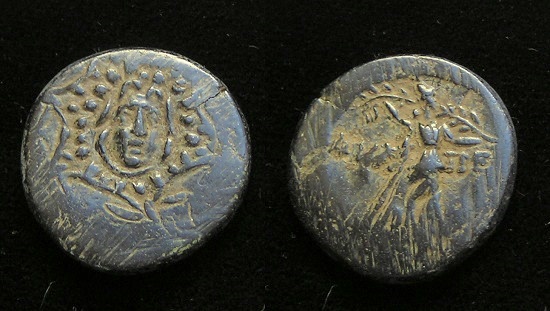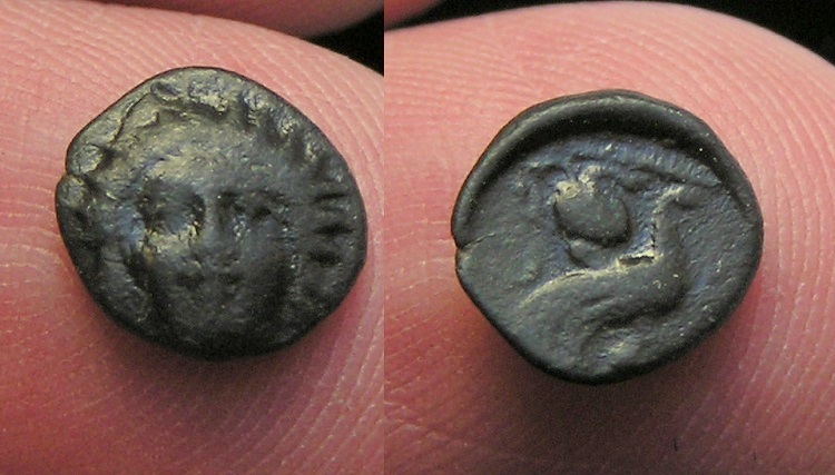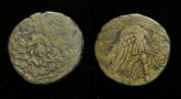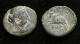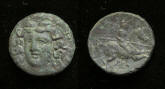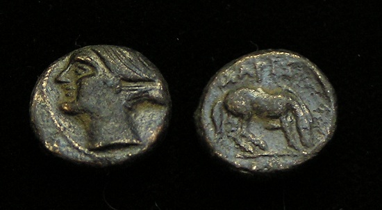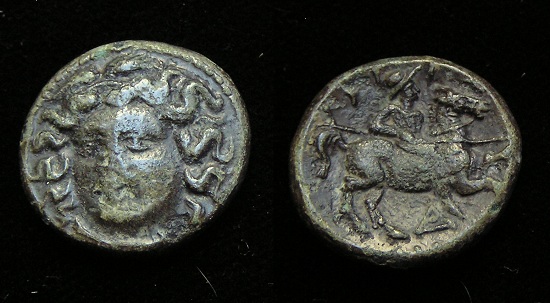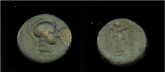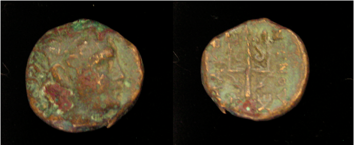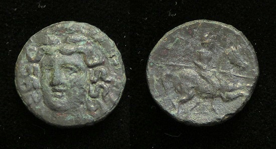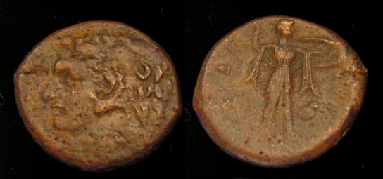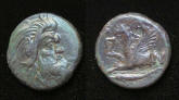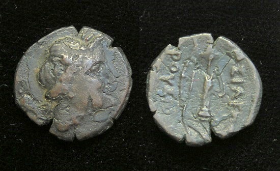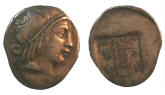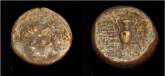 #9445: Bronze Coin - 3rd-2nd Cent BC, Historical Context: This coin was minted in Thracian Cherronesos (AKA Chersonese) about 420-350 BC. Thrace was just north and east of Macedonia on the Aegean Sea. Greek Colonists settled this area during the 8th and 7th centuries BC. The interior areas were primarily populated by the indigenous tribes. They became partially Hellenized by contact with the Greeks. Their contact with the Greeks was mainly in the form of trade. Their coinage often depicted scenes "close to nature," which explains the Lion motif of the obverse and many of the reverse symbols. Obv: Head of Janus BUY NOW $29.95 plus shipping