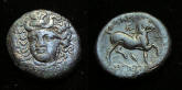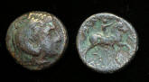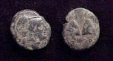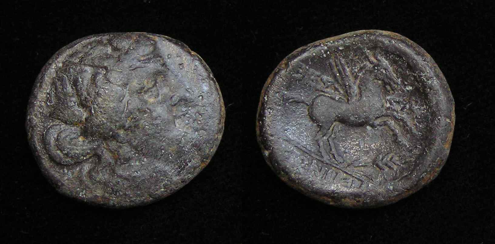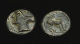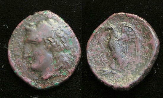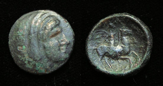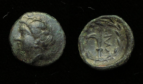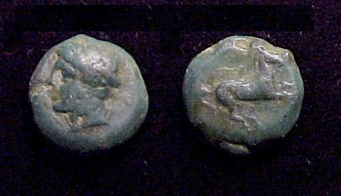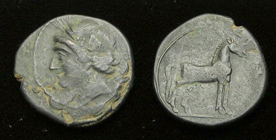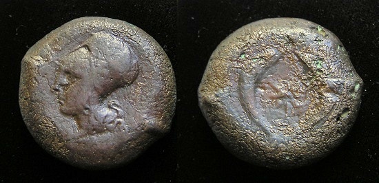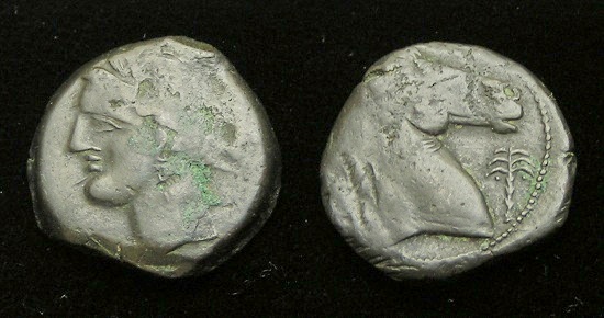 #11145 Bronze Coin, 3rd Century BC Carthage - Nemesis of the Roman Republic Historical Context: See above Obv: TANIT, Moon and Fertility goddess of Carthage BUY NOW $69.95 plus shipping