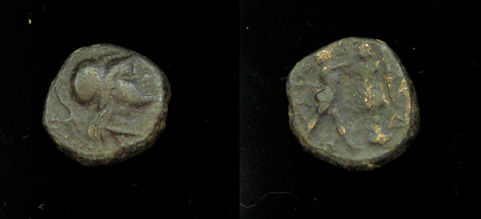 (AE16) - 250 BC, Athena with PAN Erecting Trophy !! Historical Context: See above Obv: Athena BUY NOW $22.95 plus shipping