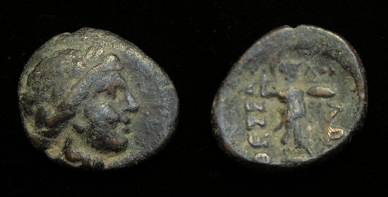 #7991: AE21 - 2nd Cent BC, Historical Context: This coin was minted by the MACEDONIAN Empire in THESSALONIKA (Northern Greece) under ROMAN RULE between 158-149 BC. This city was called THERMA in an earlier period but received its more famous name in 315 BC in honor of Kassander’s (Greek ruler) wife Thessalonika the daughter of PHILIP II and sister to ALEXANDER the GREAT. This was during the period known as the ROMAN REPUBLIC. After the fall of the monarchy, it became the capital of the second republic established by the Romans. This is a period in which the Romans were just gaining their power. Obv: Dionysos BUY NOW $49.95 plus shipping