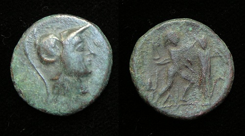 (AE18) - 250 BC, Athena with PAN Erecting Trophy !! Historical Context: This coin was minted by the MACEDONIAN Empire during the reign of Antigonus Gonatus, 277 to 239 BC. The Macedonian empire was founded by Alexander I but carried forward by others including Demetrios Poliorketes, the "Besieger" along with his father Antigonos Monopthalmos. Demetrios won an important victory over Ptolemy I in 306 BC. Antigonus Gonatus was the son of Demetrios. He regained the throne following an interregnum of 11 years. Obv: Athena SOLD $24.95 plus shipping
