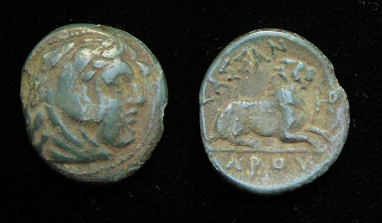 to 297 BC, Herakles / Lion Reign of Kassander !! Historical Context: This coin was minted by the MACEDONIAN Empire during the reign of Kassander, 319 to 297 BC. Obv: Herakles clad in Lionskin